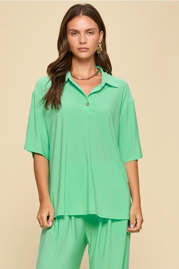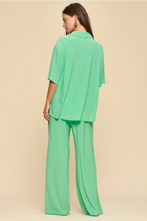 The top features a collared neckline with a partial button front, paired with wide leg pants that create a balanced, elongated silhouette. The stretch fabric offers ease of wear, making it a versatile option for both casual days and styled outings.