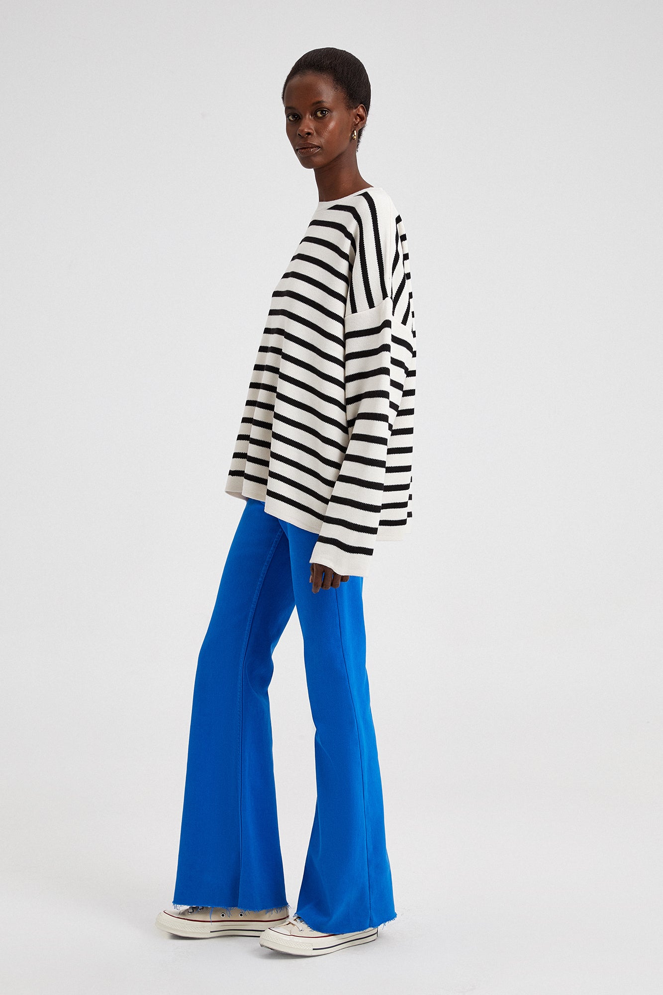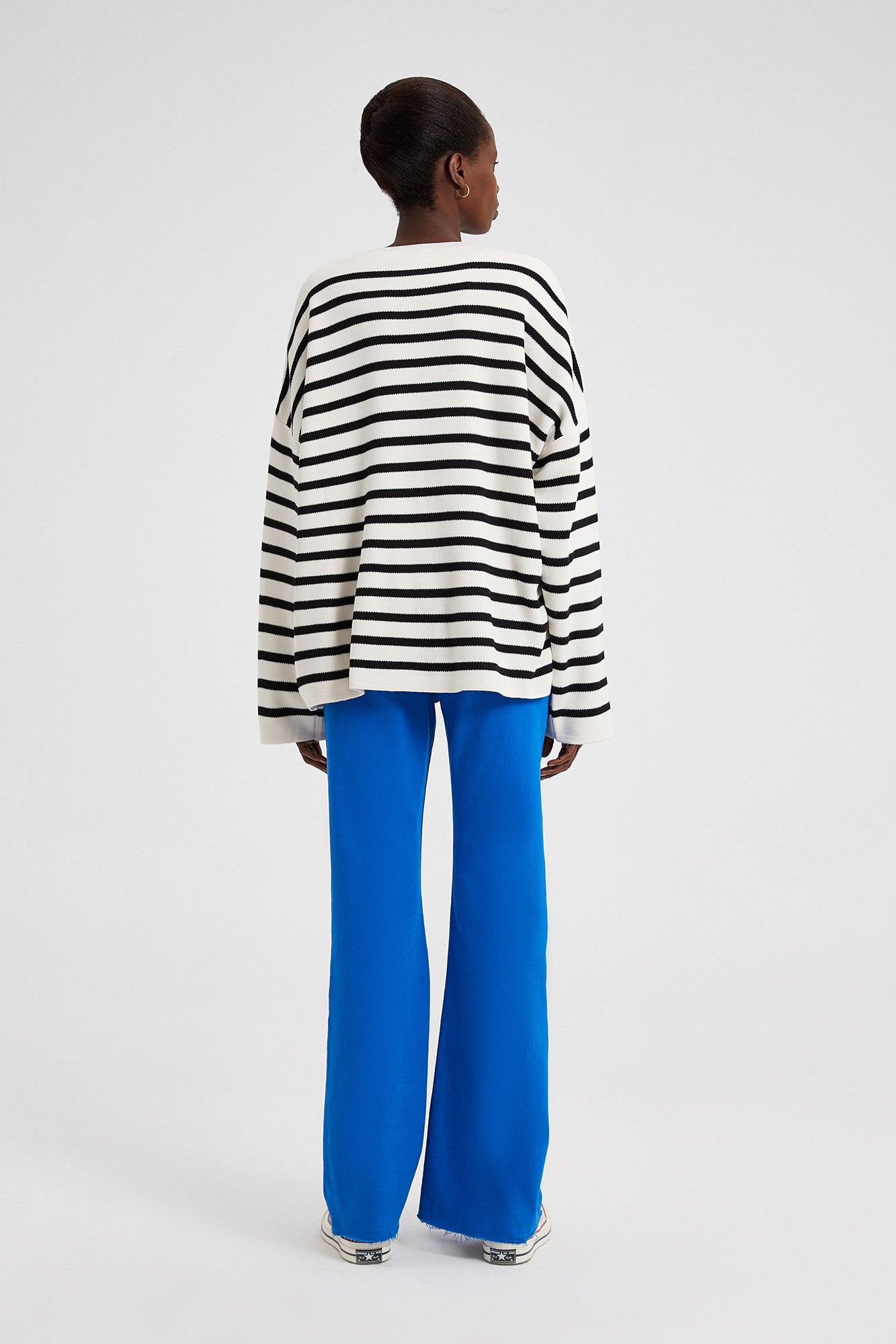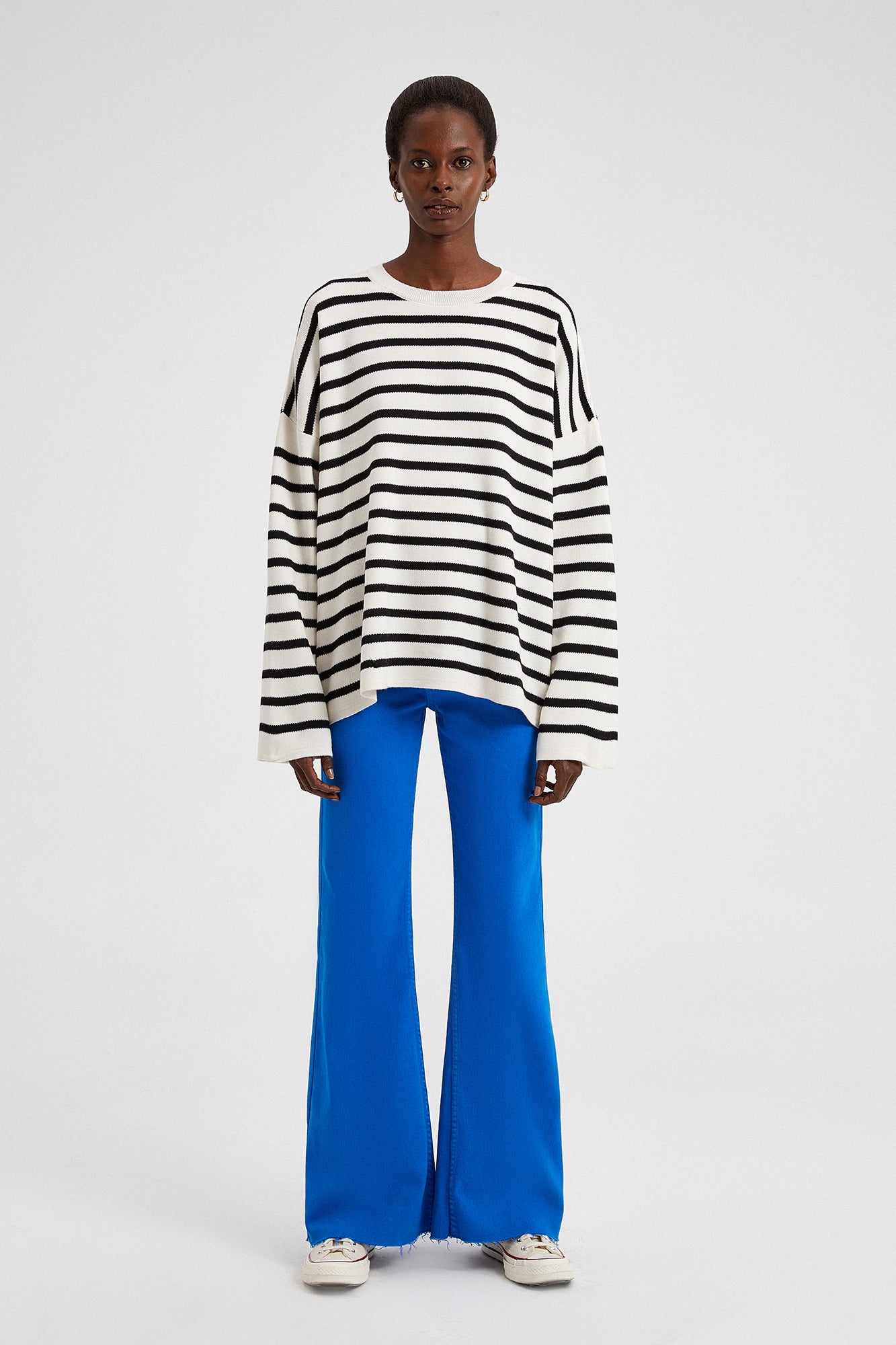 Our black and white stripe knit sweater features a bold oversized fit that delivers both comfort and statement style. The classic stripe pattern adds timeless appeal while the soft knit fabric keeps it cozy and easy to wear. Designed for relaxed everyday styling, this sweater pairs seamlessly with denim, leggings, or trousers. The oversized silhouette offers a laid-back look without sacrificing polish. A must have knit sweater that blends comfort, versatility, and classic stripe design.