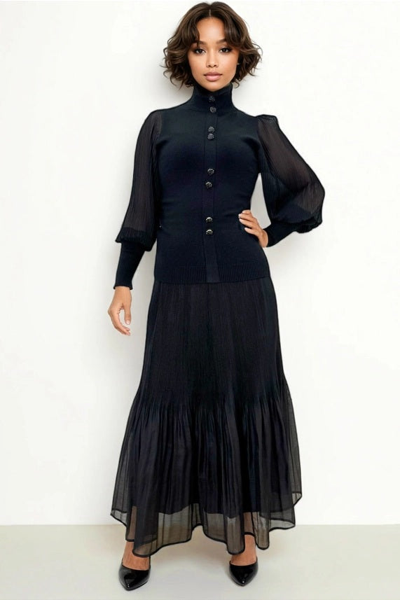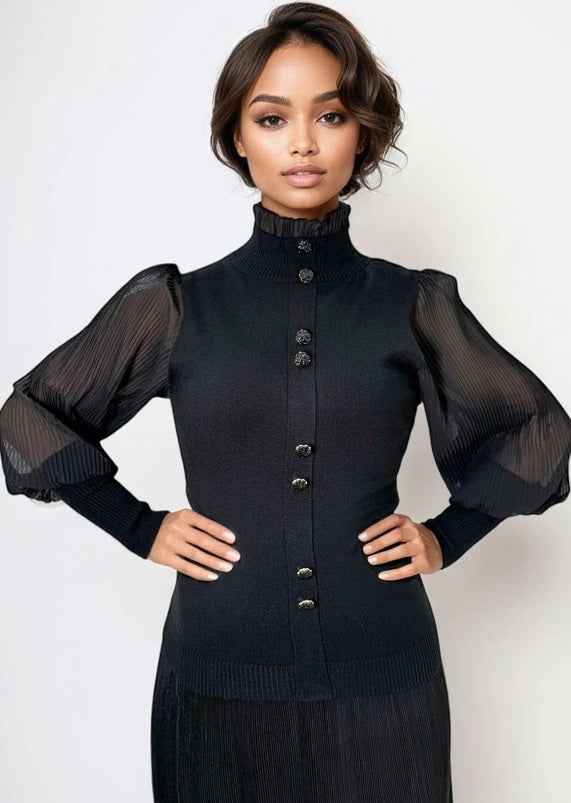 Our black knit sweater top features a high neck with sheer chiffon lantern style long sleeves that are pleated for an elegant contrast. The soft sweater knit body offers warmth and ease, while the sheer chiffon sleeves add a breathable feminine detail. The unique rose buttons adorn the sweater for a special touch. Designed to elevate everyday outfits, this sweater transitions effortlessly from casual wear to polished looks. Pair it with denim, trousers, or skirts for a refined style that feels comfortable all day. A versatile wardrobe essential that balances texture, softness, and modern appeal.