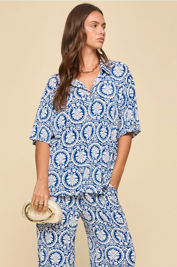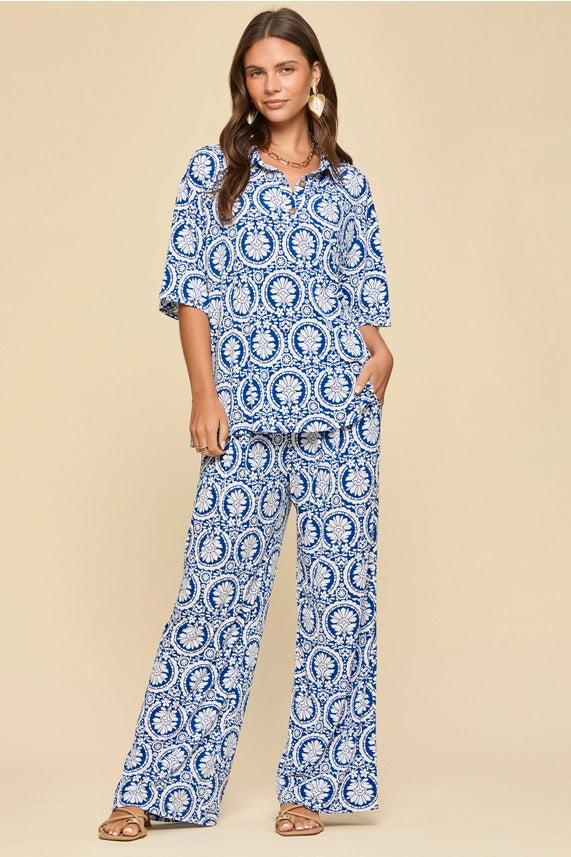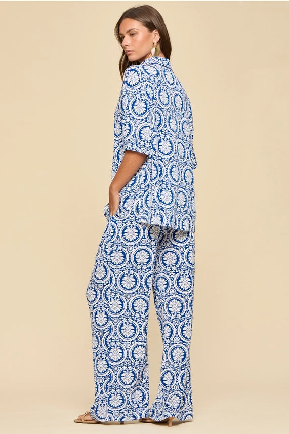 Blue Medallion Print Two Piece Pant Set
