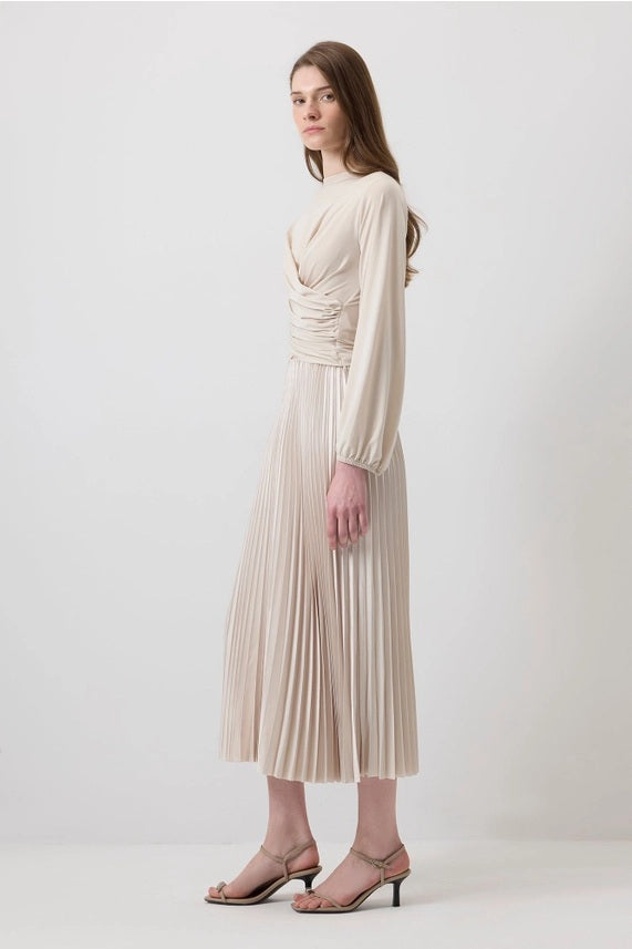 Our cream tone draped blouse with balloon sleeves offers a flattering wrap style bodice with gentle ruching at the waistline. Elegant and timeless, this piece contours beautifully while offering a modest silhouette with femininity. We love the balloon sleeves with elastic hem cuff for a refined look. Ideal for formal occasions or sophisticated everyday looks. A must have for lovers of minimalist and romantic aesthetics.