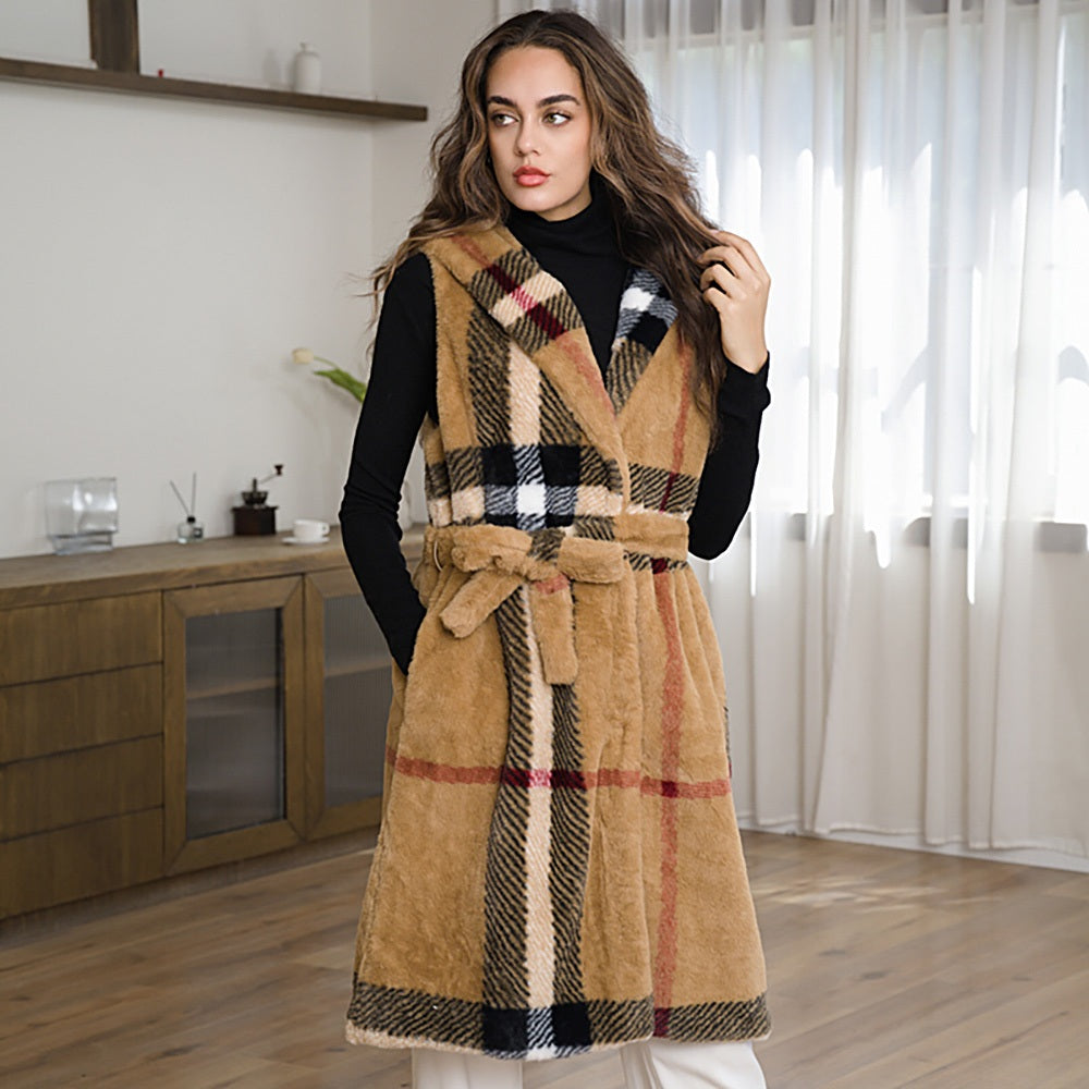 Faux Fur Plaid Vest with Hood And Belt
