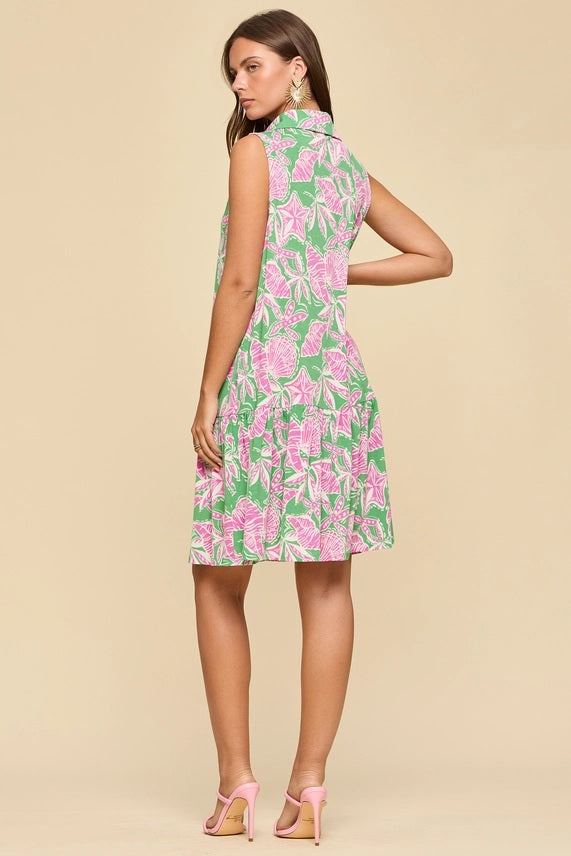 The collared neckline with a partial button front adds a polished touch, while the sleeveless cut keeps it cool for warm days. A tiered hem adds movement and soft structure, giving the dress a playful finish.