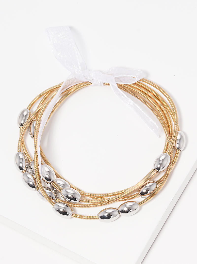 Set of five spring stretch gold wire bracelets with silver beads are a unique look for everyday.