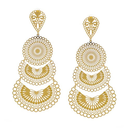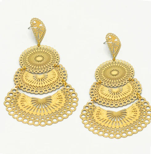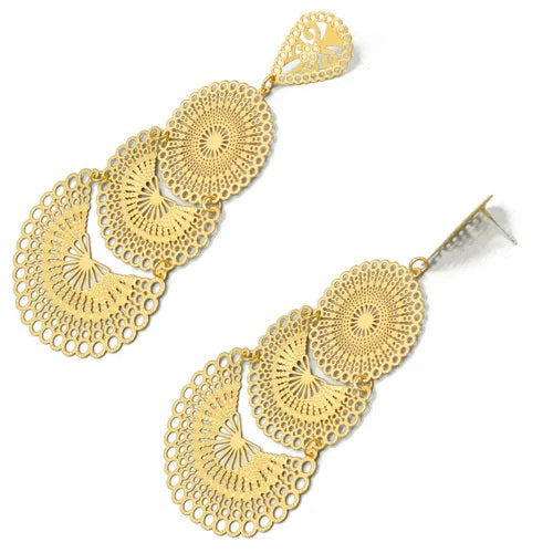 Turn heads with our gold filigree lightweight earrings, designed to add instant elegance to any look. Crafted with intricate filigree detailing, they offer a bold yet airy feel that makes them perfect for all-day wear. Measuring 4 inches long, these statement earrings are feather-light and secure with a post back closure for easy, comfortable styling. Whether paired with everyday outfits or evening wear, they deliver timeless sophistication and shine.