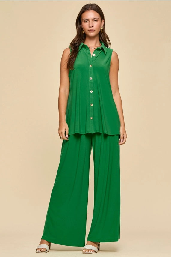 Clean fluid fit define our kelly green sleeveless button front pant set. The relaxed silhouette drapes smoothly, creating an easy, polished look with comfortable movement.