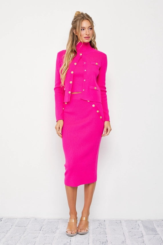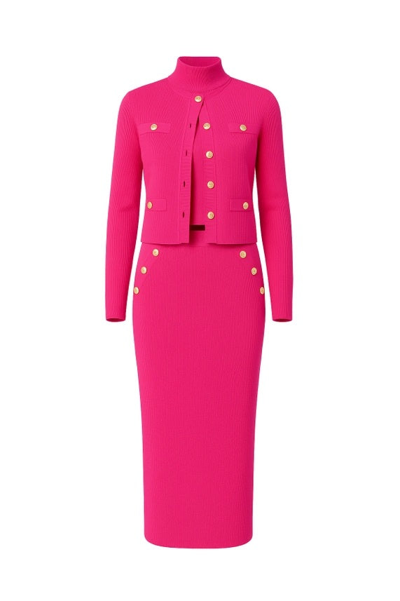 Make a bold statement with our magenta three piece knit cardigan, mock neck top, and midi skirt set. Designed for comfort and style, this coordinated knit trio delivers effortless elegance with a modern edge. The mock neck top creates a sleek silhouette, the midi skirt adds flattering movement, and the matching cardigan completes the look for versatile layering. Wear all three pieces together for a polished outfit or mix and match for endless styling options. Perfect for brunch, work, or evenings out, this knit set combines cozy comfort with standout color.