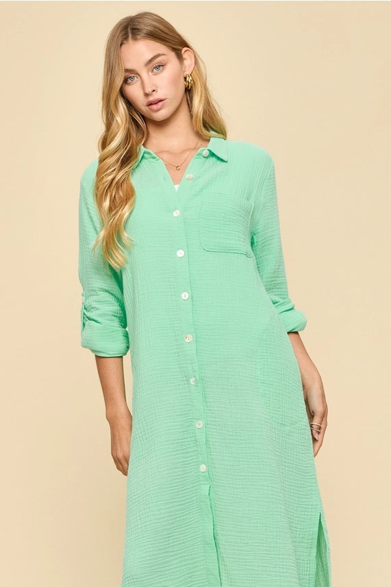 Mint Textured Button Down Shirt Dress Details:
