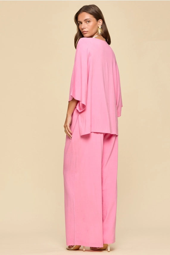 The top features a v neckline with button accents and loose, flowy sleeves that create a gentle, effortless shape. The matching wide leg pants fall smoothly for a flattering, easy fit that doesn’t feel restrictive.