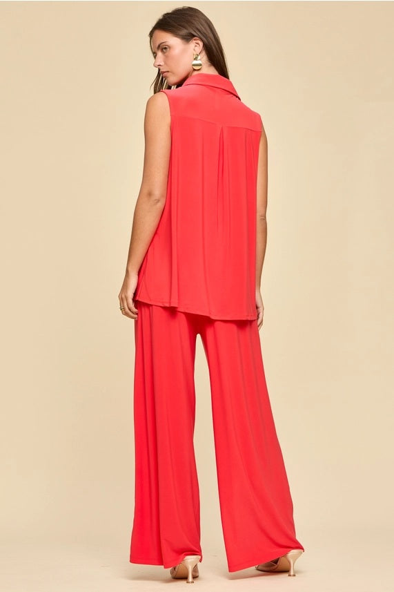 Bold color and a fluid silhouette define our tomato red sleeveless button front pant set. Designed with a relaxed fit, it drapes smoothly for a comfortable, polished look that moves with ease.
