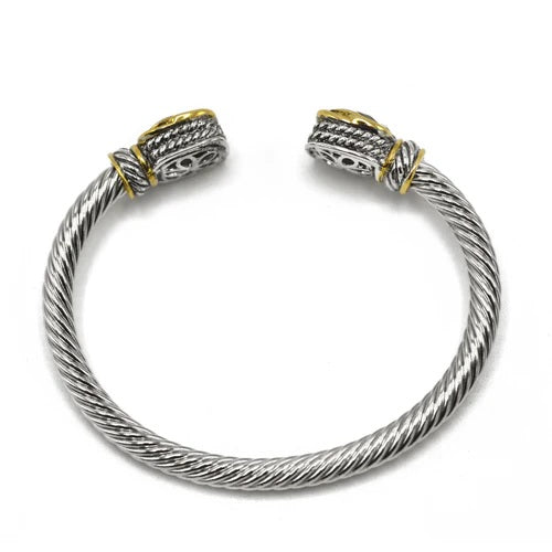 Elevate your look with our two-tone amethyst crystal classic cable bracelet, featuring a stunning mix of silver and gold tones for versatile, timeless style. The open bangle design offers comfort and sophistication, while the sparkling amethyst crystals add a luxurious pop of color. Crafted with exceptional quality, this bracelet’s 3.5-inch diameter ensures a perfect fit for effortless elegance and ideal for layering or wearing solo. Due to the open nature, you can slightly open and close the bangle for an even more customized fit. Great for gift giving.