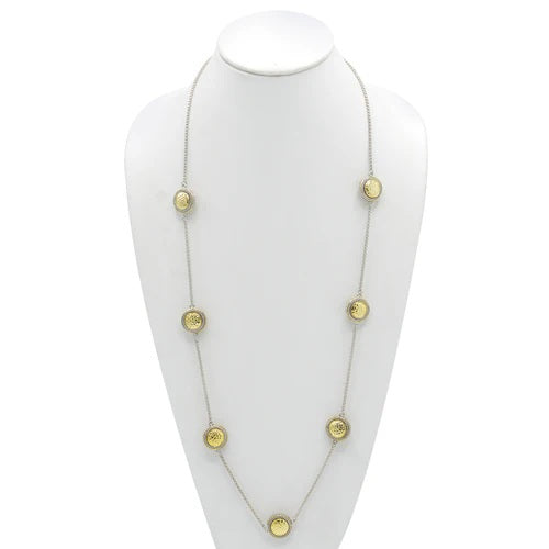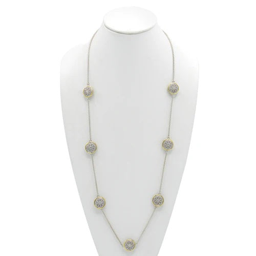 Bring timeless elegance to your look with this Two Tone Crystal Marcasite Reversible Floral Necklace. Measuring 36 inches long, it offers an effortlessly elongated silhouette that can be styled alone or layered with other favorites. Designed with a reversible two-tone finish in silver and gold hues, this versatile necklace provides two looks in one — perfect for coordinating with any outfit. The floral motif stations and glass crystal marcasite accents add a touch of sparkle and vintage charm, making it an exquisite accessory for both casual and dressy occasions.