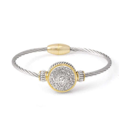 Elevate your jewelry collection with our two tone crystal marcasite twisted rope bracelet. Its intricate twisted rope design, accented with sparkling crystal and marcasite detailing, creates a look of timeless sophistication. Our bracelet adds the perfect touch of elegance and shimmer, whether worn alone or layered with other pieces. The versatile two-tone finish allows it to complement both silver and gold jewelry effortlessly.