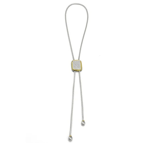 Elevate your everyday look with our two tone silver rectangular pave crystal pendant necklace. Designed in a sleek lariat style, this necklace features a sparkling rectangular pave crystal pendant on an adjustable open-ended chain. Simply pull either strand to adjust the length to your desired fit. With its 30-inch chain and modern two-tone finish, this necklace blends sophistication with versatility, making it ideal for both day and evening wear. Pair it with our two tone pave crystal engraved classic cable bracelet and two tone pave crystal post earrings for a coordinated jewelry set that radiates timeless elegance.