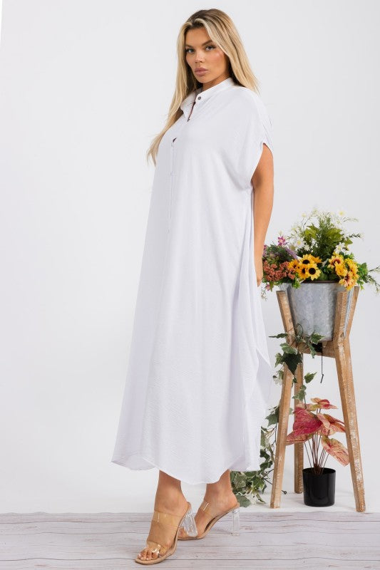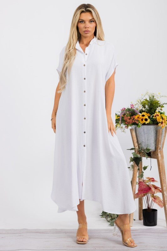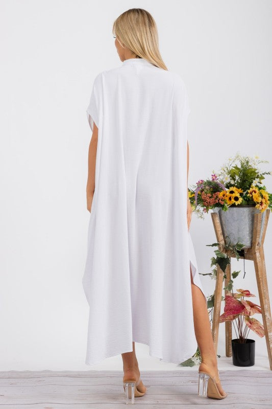 Relaxed shape and fluid movement define our white oversized button front maxi dress. Designed with a loose, airy fit, it drapes naturally for an easy, understated look. Wear as a dress or exaggerated cardigan.